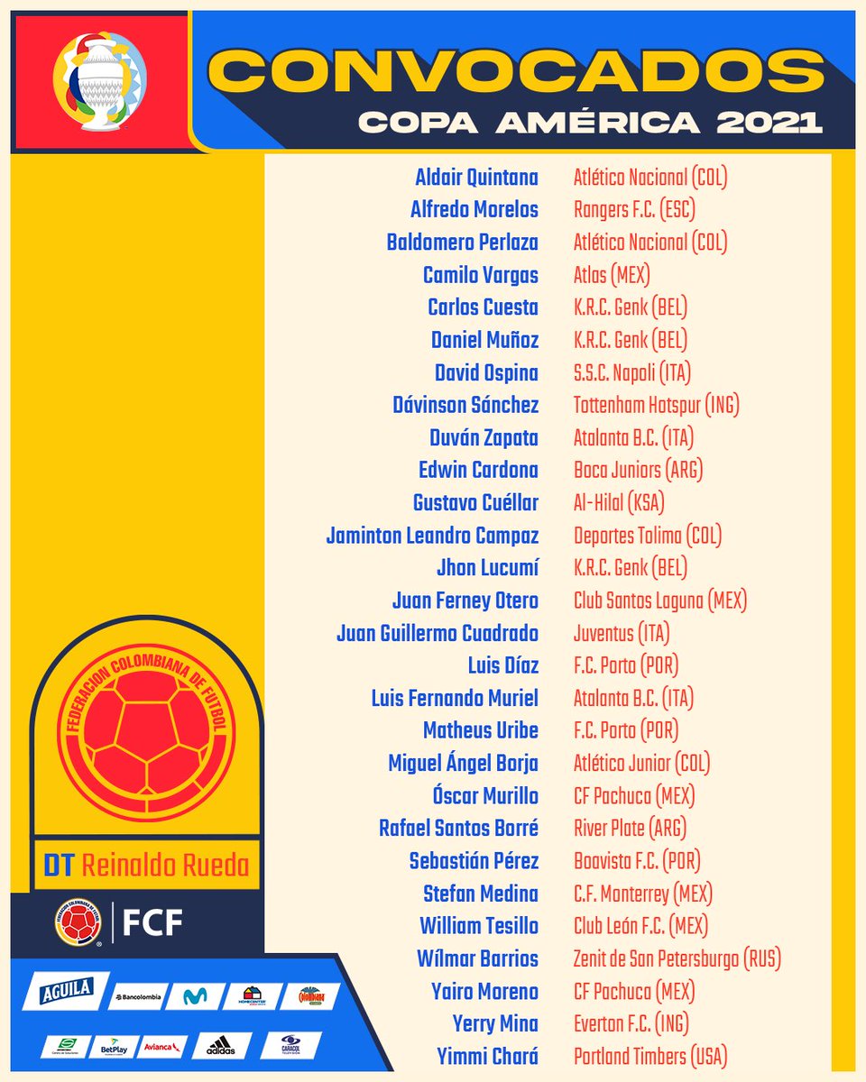 Aldair Quintana Alfredo Morelos Baldomero Perlaza Camilo Vargas Carlos Cuesta Daniel Muñoz David Ospina Dávinson Sánchez Duván Zapata Edwin Cardona Gustavo Cuéllar Jaminton Campaz Jhon Lucmà Juan Ferney Otero Juan Guillermo Cuadrado Luis DÃaz Luis Fernando Muriel Matheus Uribe. El técnico Carlos Queiroz la dio a conocer por medio de un video en rueda de prensa en la. Lista final para la Copa América 2021 Con Juan Cuadrado a la cabeza Reinaldo Rueda oficializó la lista de convocados para la Copa América 2021.
